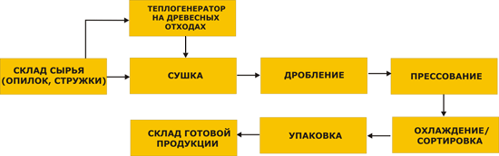 Вывод: Из графика видно, что самый дешевый энергоноситель в России - это магистральный газ, затем идут пеллеты. Как делают пеллеты? Пеллеты получают путем измельчения сырья до состояния муки. Затем его сушат до влажности от 8 до 12%. Далее гранулирование, в специальном устройстве напоминающее собой «мясорубку» - гранулятор. Склеивание древесных пеллет происходит за счет содержания вещества - лигнина, которое при нагревании обеспечивает создание требуемой формы. В пеллеты не добавляют никаких дополнительных примесей клея и т.д. Пеллеты это экологически чистое топливо. Процесс производства пеллет выглядит следующим образом: